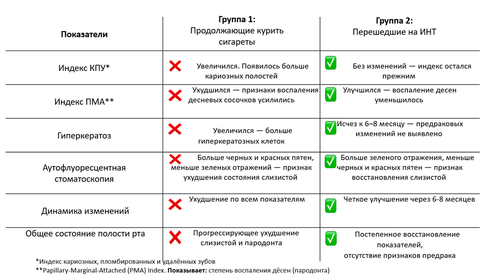 – С данными можно подробнее ознакомиться в таблице (см. таблицу). В целом же мы увидели, что уже через шесть-восемь месяцев начиналось улучшение состояния ротовой полости у тех, кто перешёл с сигарет на употребление изделий с нагреваемым табаком. В то время как у продолжающих курить сигареты практически все индикаторы ухудшились.