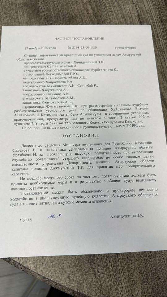 Судья межрайонного специализированного суда по уголовным делам Атырауской области Зарема Хамидуллина после оглашения приговора вынесла частное постановление в отношении Хажмуратова в адрес министра внутренних дел Ержана Саденова и главы департамента полиции Атырауской области Нурхата Уразбаева о поощрении следователя.