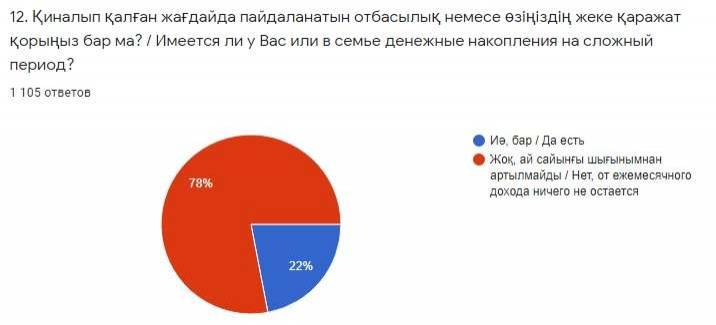 Оған қоса, Қазақстанда халықтың көпшілік бөлігінде жинақ қоры, сәйкесінше "ауыр күндерге" сақталған қаражаты бар деп сенімділікпен айту қиын. Мысалы, "Rysqulov Аnalytics" зерттеушілерінің карантин уақытында жүргізген әлеуметтік сауалнамасы нәтижелеріне сәйкес, "Қиналып қалған жағдайда пайдаланатын отбасылық немесе өзіңіздің жеке қаражат қорыңыз бар ма?" деген сауалға 78,1% респондент, яғни, 859 азамат "Жоқ, ай сайынғы шығынымнан артылмайды" деп мәлімдеген. Қалған 21,9% яғни 241 азамат "Иә, бар" деп жауап берген.