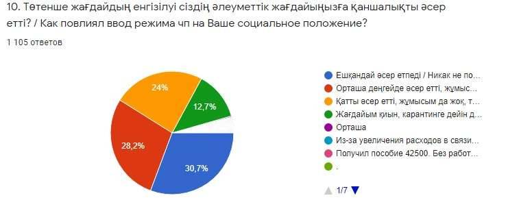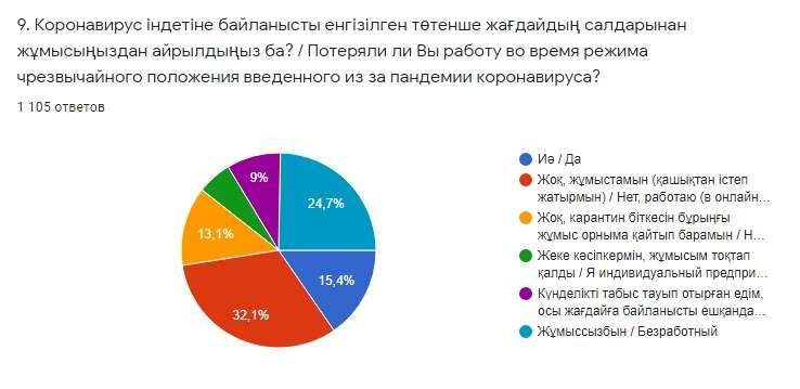 Аталған мәселеге байланысты "Rysqulov Аnalytics" зерттеу орталығы халық арасында сауалнама жүргізген болатын. Сауалнамаға жасы 18-ден жоғары, ҚР азаматы болып табылатын 1 100 респондент қатысты. Сауалнама нәтижесі бойынша "Коронавирус індетіне байланысты енгізілген төтенше жағдайдың салдарынан жұмысыңыздан айрылдыңыз ба?" деген сұраққа сауалнамаға жауап берген азаматтардың 24,6% "Жұмыссызбын" және 15,5% "Иә, жұмыстан айырылдым" деп жауап берген. 8,9% респонденттер "Күнделікті табыс тауып отырған едім, осы жағдайға байланысты жұмыс жоқ" деп жауап берген. Сонымен қатар, 5,7% сауалнамаға жауап берген азаматтар "Жеке кәсіпкермін, жұмысым тоқтап қалды" деп хабарласа, 32,1%-ы "Жоқ, жұмыстамын, қашықтан істеп жатырмын". Қорыта айтқанда, сауалнама нәтижесі дәл қазіргі карантин жағдайында 67,9% респонденттердің жұмыссыз отырғанын көрсетеді.