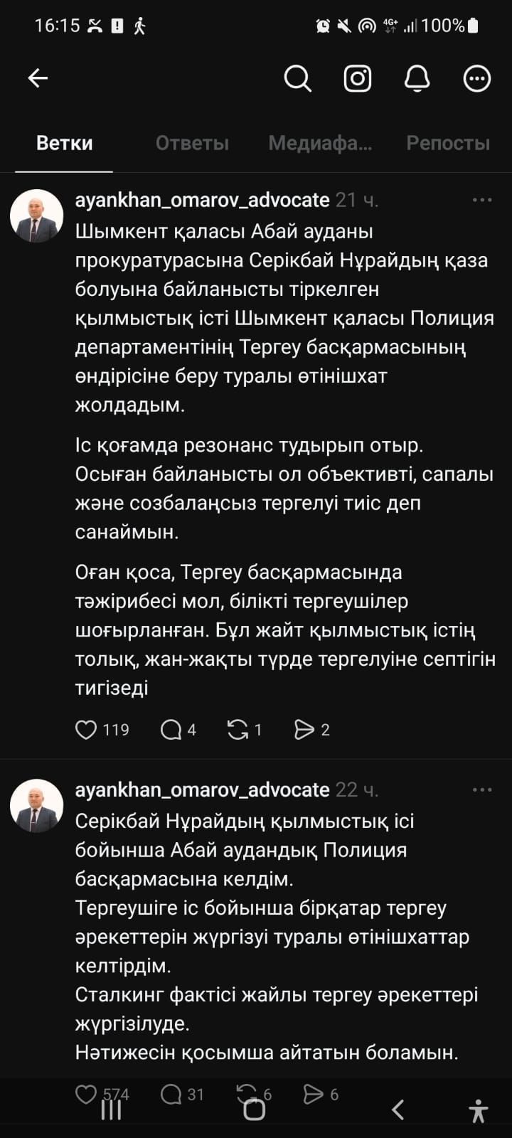 "Шымкент қаласы Абай ауданы прокуратурасына Серікбай Нұрайдың қаза болуына байланысты тіркелген қылмыстық істі Шымкент қаласы Полиция департаментінің Тергеу басқармасының өндірісіне беру туралы өтінішхат жолдадым. Іс қоғамда резонанс тудырып отыр. Осыған байланысты ол объективті, сапалы және созбалаңсыз тергелуі тиіс деп санаймын. Оған қоса, Тергеу басқармасында тәжірибесі мол, білікті тергеушілер шоғырланған. Бұл жайт қылмыстық істің толық, жан-жақты түрде тергелуіне септігін тигізеді. (...). Тергеушіге іс бойынша бірқатар тергеу әрекеттерін жүргізуі туралы өтінішхаттар келтірдім. Сталкинг фактісі жайлы тергеу әрекеттері жүргізілуде. Нәтижесін қосымша айтатын боламын", – деп жазды адвокат.