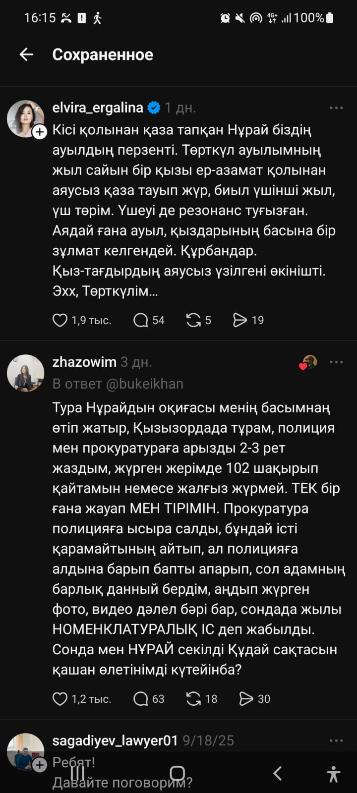 "Кісі қолынан қаза тапқан Нұрай біздің ауылдың перзенті. Төрткүл ауылымның жыл сайын бір қызы ер-азамат қолынан аяусыз қаза тауып жүр, биыл үшінші жыл, үш төрім. Үшеуі де резонанс туғызған. Аядай ғана ауыл, қыздарының басына бір зұлмат келгендей. Құрбандар. Қыз-тағдырдың аяусыз үзілгені өкінішті. Эхх, Төрткүлім...", – деп жазды психолог Эльвира Ергалина.