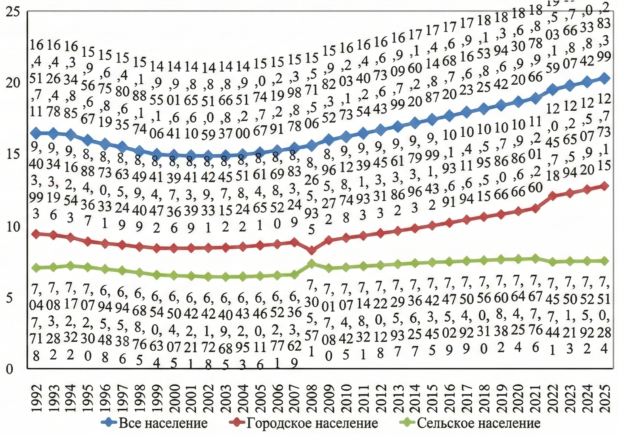 - 2002-2024 жылдар: Тұрақты және үздіксіз өсу кезеңі. Осы жылдары ел тұрғындарының саны 36,4%-ға немесе 5,4 млн адамға артты.