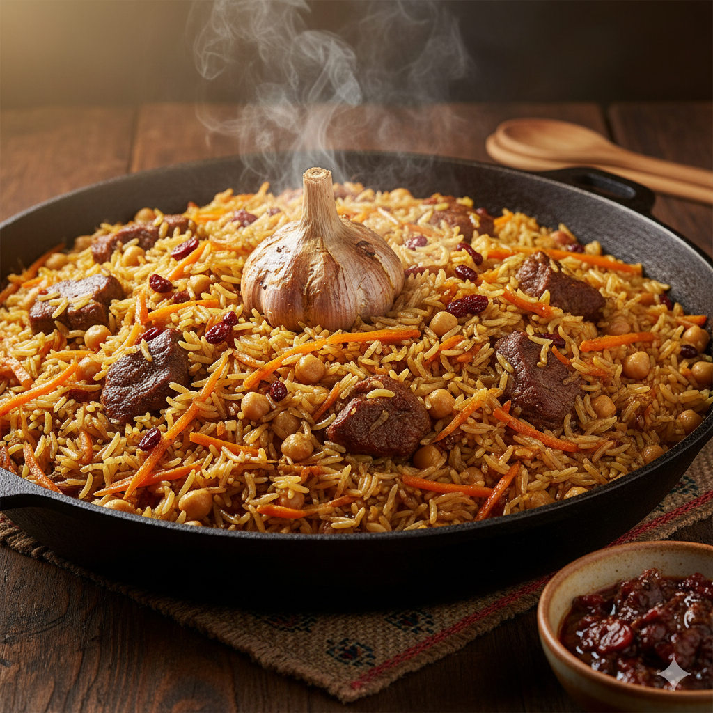 Етті текшелеп турап, қазанда қыздырылған майға етті қызарғанша қуыру қажет. Кейін пияз бен сәбізді қосып, тағы 7-10 минут қуырыңыз. Кейін дәмдеуіштерді қосып, қайнатылған ноқатты салып, аздап су құйып, ет жұмсарғанша 20-30 минут бұқтыру қажет. Сол аралықта күрішті суы мөлдір болғанша жуып, ет пен сәбіздің үстіне тегістеп салу қажет. Күріш 1-2 см батып тұратындай мөлшерде қайнаған су құйып, қазанның ортасына тұтастай сарымсақ басын салу керек. Қазанның астындағы отты азайтып басып, қақпағын жауып, күріш суды толығымен сіңіргенше 20-25 минут қайнату қажет. Піскен кезде оттан алып, 10 минут демдеп, абайлап араластырып, дастарқанға ұсынуға болады.
