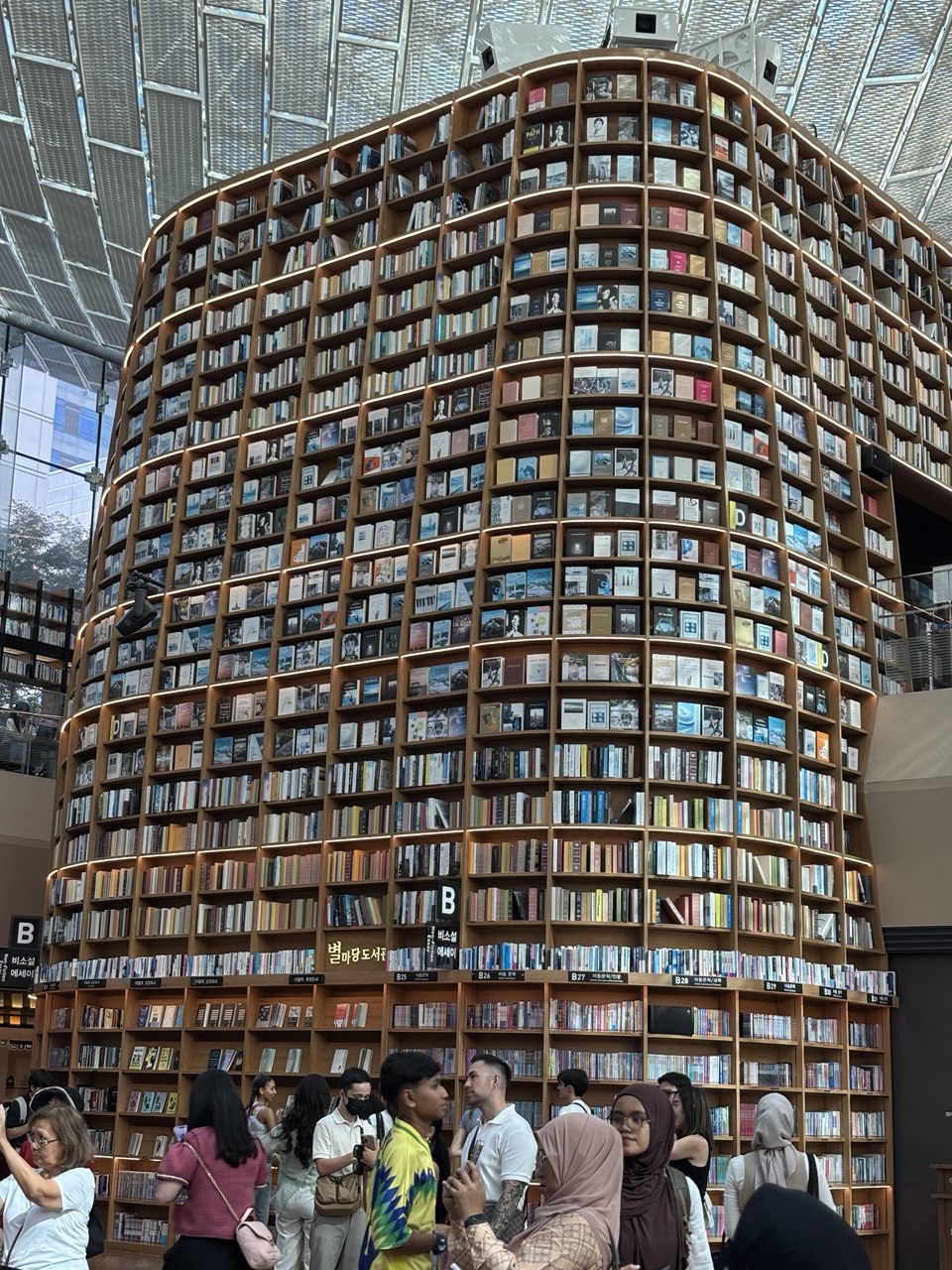 Сеулдің қақ жүрегіндегі Starfield COEX Mall орталығына кірген сәтте көз алдыма ең әсем көріністердің бірі ашылды – ол әйгілі Пёльмаданг кітапханасы (Starfield Library). Бұл жер – жай ғана кітапхана емес, ол – білім мен шабыттың заманауи ғибадатханасы, рух пен өнердің тынысы сезілетін ерекше кеңістік.