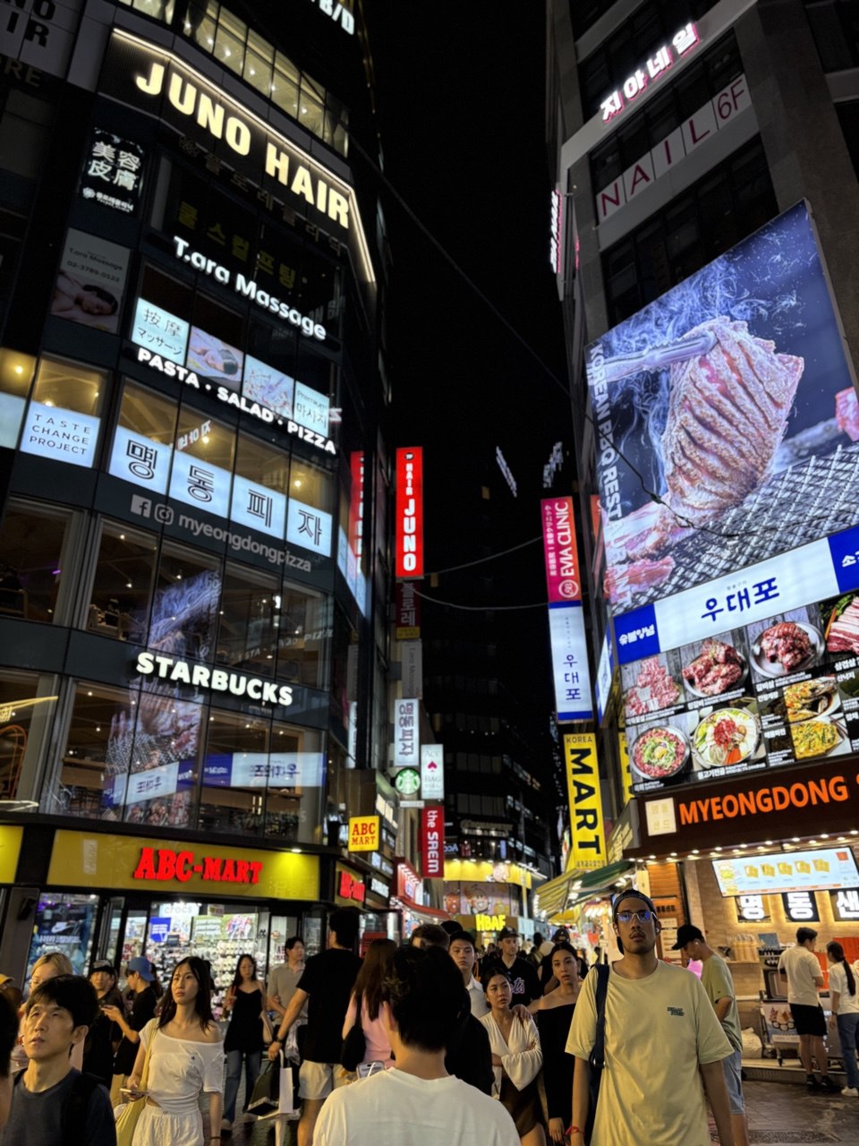 Сапарымның ең қарбалас әрі әсерлі аялдамаларының бірі – Мёндон сауда көшесі болды. Бұл жерді Сеулдің "энергия орталығы" десе де болады. Таңнан кешке дейін үзілмейтін қозғалыс, жарқыраған шамдар, түрлі тілде сөйлесіп жатқан адамдар, көше тағамының иісі мен музыка – бәрі бірігіп, Мёндонға өзіне ғана тән ерекше атмосфера сыйлайды.