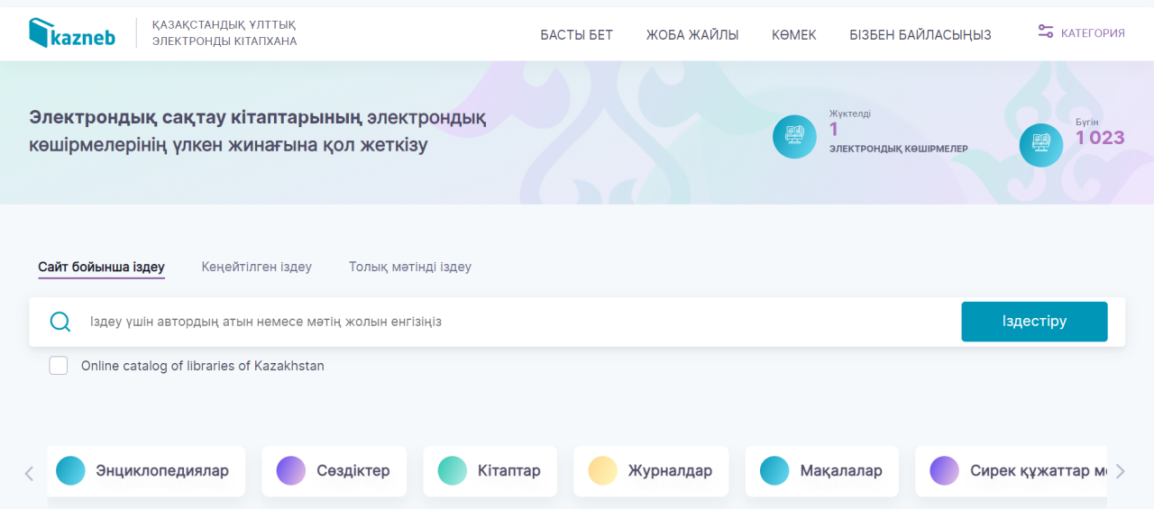 Қазақстандық Ұлттық электронды кітапхана – кітаптар, энциклопедия, сөздік, сирек құжаттар мен қолжазбалар, газет-журналдар, аудио-бейне файлдар топтастырылған жоба.