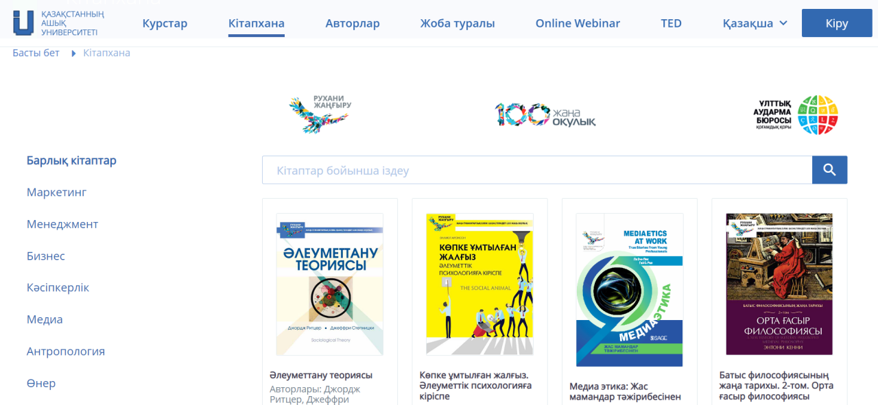 Қазақстанның ашық университеті – "Жаңа гуманитарлық білім. Қазақ тіліндегі 100 жаңа оқулық" жобасының аясында аударылған кітаптар және еліміздің жетекші жоғары оқу орындары мен мамандары бірлесе әзірлеген онлайн-курстар жинақталған білім беру платформасы.