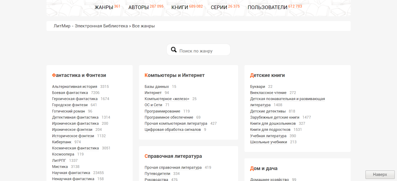 Мұнда қазақ және әлем әдебиетінің 2000-ға жуық кітабы пен 600-ден аса аудиокітап жинақталған. Олар көркем шығармалар, тарихи шығармалар, ғылыми әдебиеттер, іскерлік әдебиеттер, публицистика, романтика, психология, бизнес, ертегілер және тағы да басқа бірнеше санатқа бөлінген.