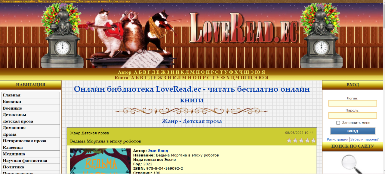 Loveread– кітаптарды тегін оқуға болатын электронды кітапхана. Барлық материалдар ашық көздерден алынған. Платформада кітаптарды тек онлайн оқуға болады, жүктеп алу мүмкіндігі берілмеген. Қордағы кітаптар 20-дан астам жанрға бөлінген. Кітаптар орыс тілінде қолжетімді.