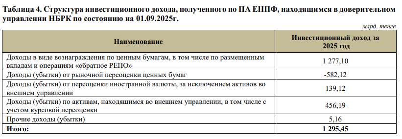За последние 12 месяцев, с сентября 2024 года по август 2025-го, по счетам казахстанцев распределили инвестиционный доход в размере 2,74 трлн тенге, показатель доходности составил 12,6% при инфляции в 12,2%.