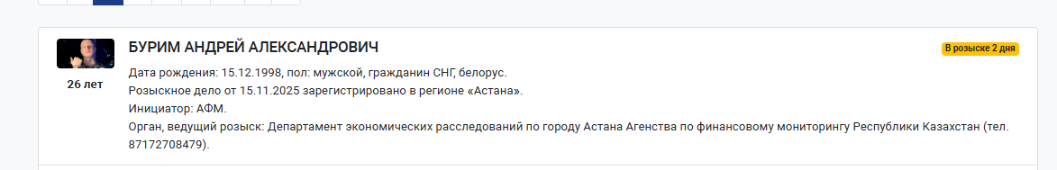 Согласно информации на сайте, 26-летний блогер разыскивается департаментом экономических расследований по Астане Агентства по финмониторингу Казахстана с 15 ноября.