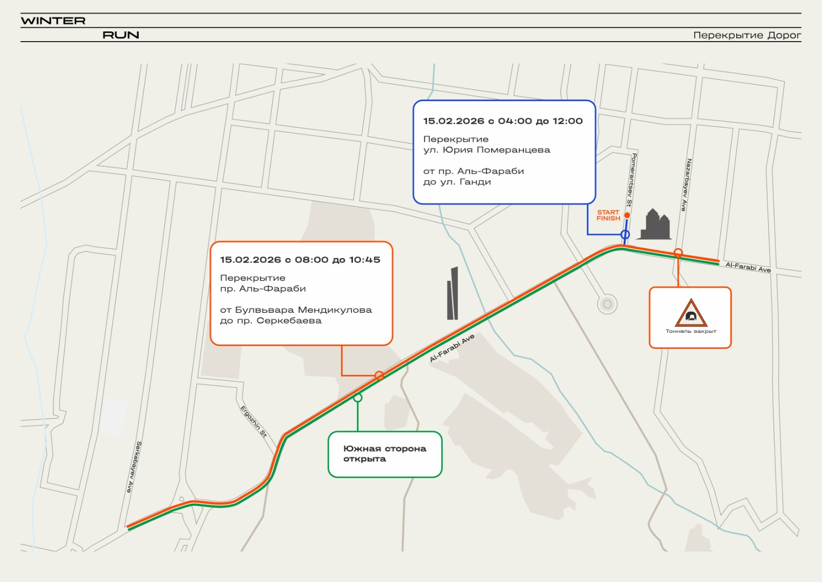 Южная сторона Аль-Фараби останется открытой. Объезд в восточном направлении организуют по улице Тимирязева. Координаторы забега пояснили, что ограничения необходимы для безопасного прохождения дистанций участниками и минимизации рисков для горожан.