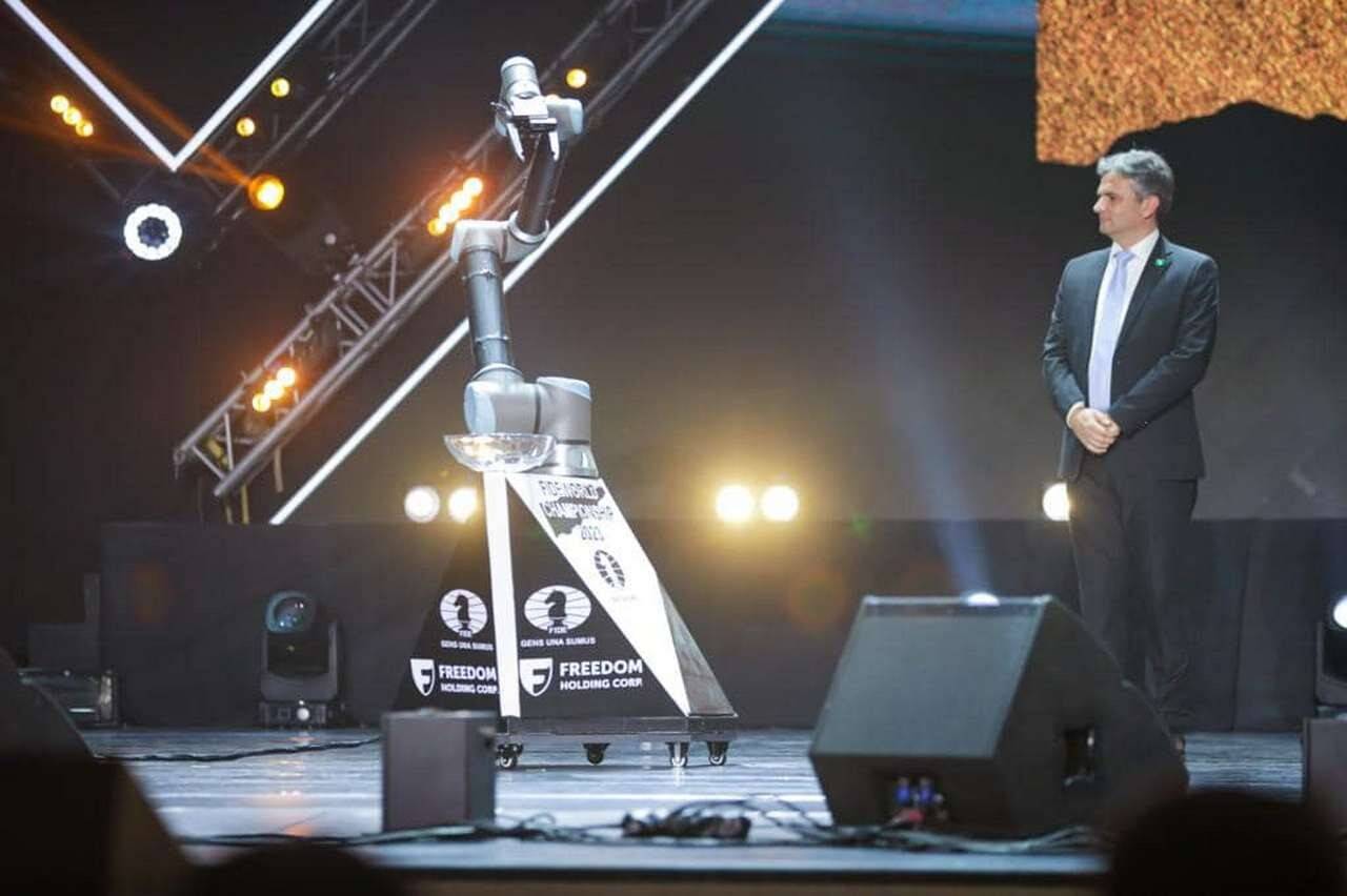"Церемония завершилась жеребьёвкой, и к ней организаторы подошли нетрадиционно: цвет фигур, которыми шахматисты будут играть в первом матче, определил специальный робот. До 1 мая ведущие шахматисты планеты, Ян Непомнящий и Дин Лижэнь, будут бороться за звание абсолютного чемпиона мира.", – сообщил министр.
