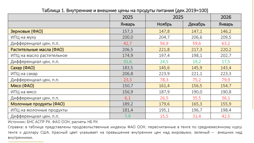 Такая разница означает, что за последние годы отдельные продукты внутри Казахстана дорожали быстрее, чем менялись мировые продовольственные индексы. При этом мировые показатели в таблице приведены в тенге по среднемесячному курсу, поэтому на сравнение влияет и динамика курса.