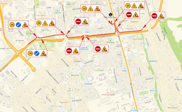 Его меняют на участке от пересечения улиц Луганского и Армянской до парковки ТРЦ "Esentai Mall" и по бульвару Мендыкулова. Движение частично ограничили по северной стороне проспекта от Луганского через проспекты Достык, Назарбаева, улицу Померанцева и до улицы Каратаева.