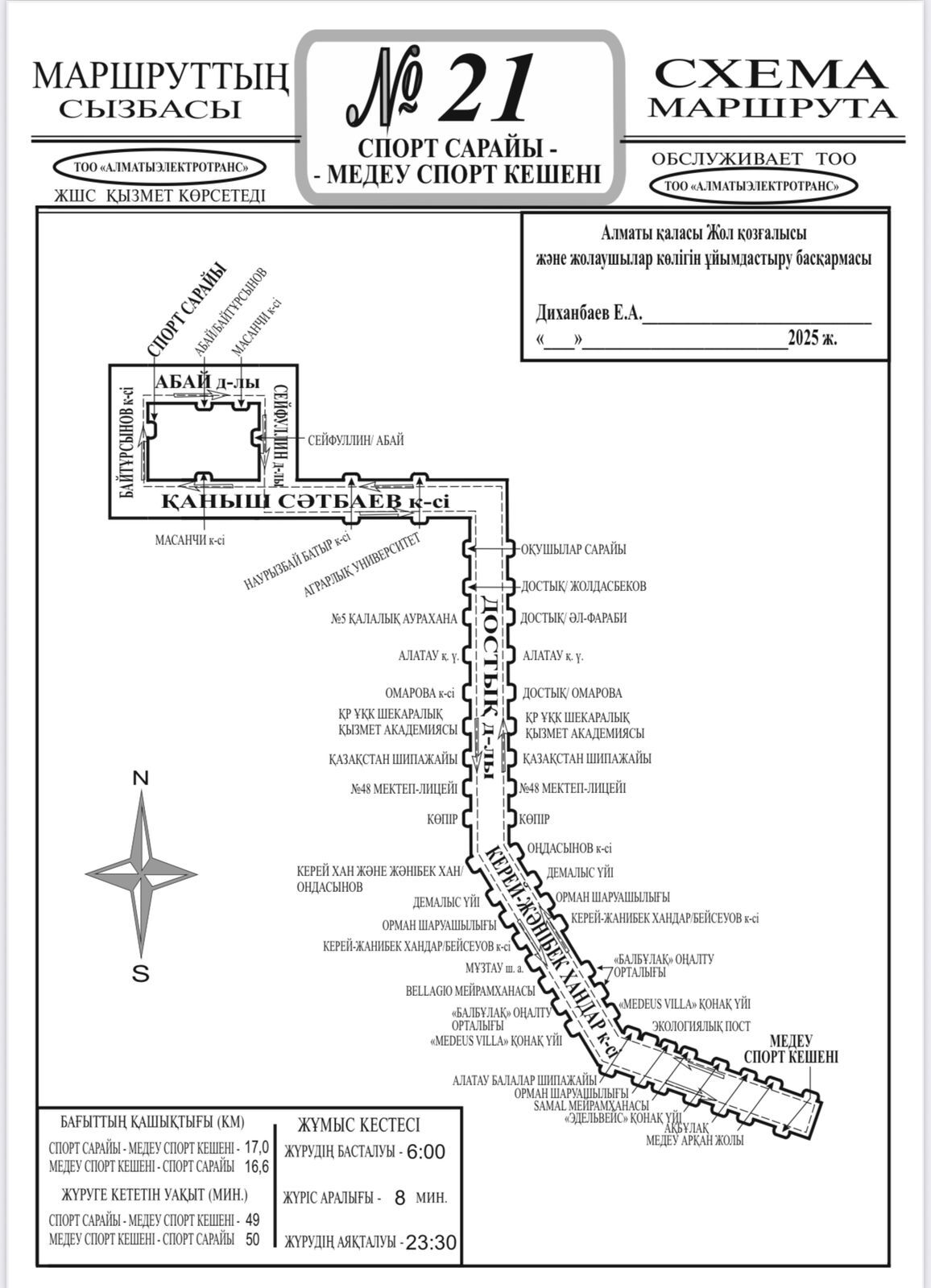 Подвижной состав начнёт курсировать с 27 ноября с интервалом 8 минут. На маршрут №21B, который обслуживает коммунальный автопарк "Алматыэлектротранс", выйдут 15 автобусов. Они будут ходить с 6.00 до 23.00. Общая протяжённость маршрута составит 33,6 км.