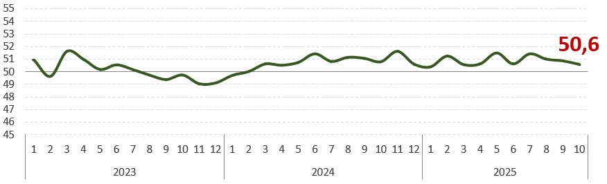 Индекс деловой активности снизился с 50,9 до 50,6 в октябре. В горнодобывающей промышленности этот индекс снизился с 49,4 до 48,5. Между тем в производстве отмечен рост с 52,9 до 53.