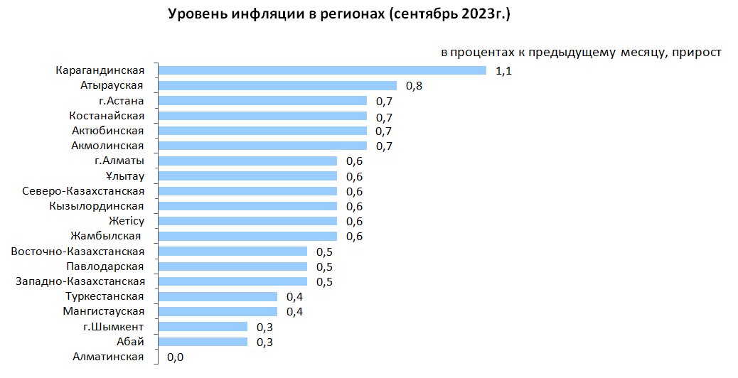 Среди регионов самая высокая месячная инфляция зарегистрирована в Карагандинской области – 1,1%, самая низкая – в Алматинской области.