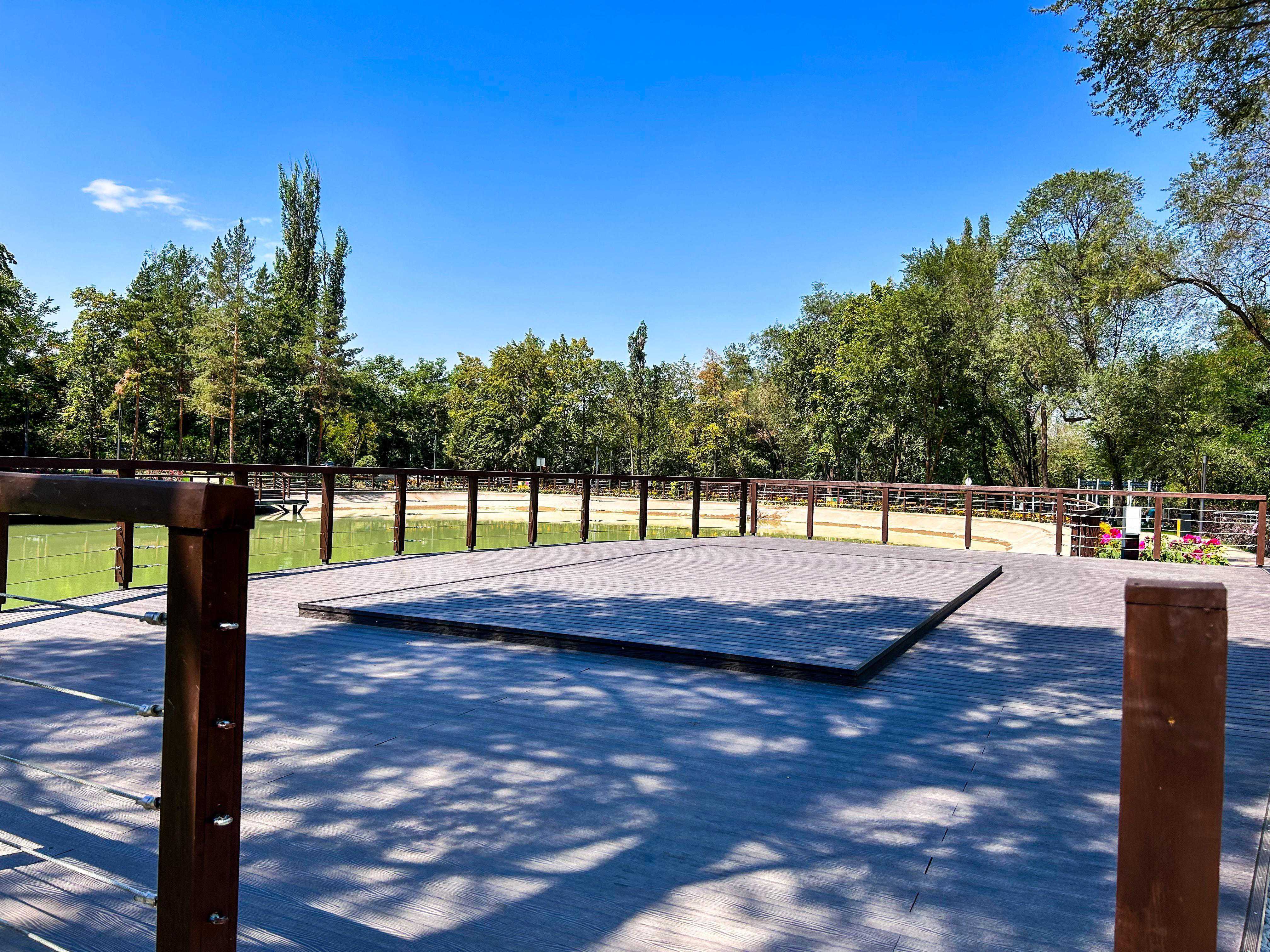 У реки построили сцену с амфитеатром под открытым небом. Посетители смогут сыграть на теннисном корте, поиграть в шахматы за специальными столами и потренироваться на современных спортивных снарядах. Для детей предусмотрены площадки с игровой экозоной.