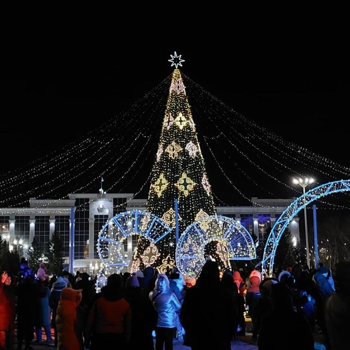 Огни главной ёлки города зажглись 26 декабря. Ёлку поставили на площади "Ынтымак". По данным акимата, в этом году деньги на новогодние украшения не выделяли.
