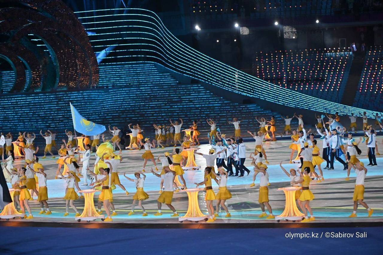 Во время масштабного представления, в рамках которого прошли выступления артистов, цифровой фейрверк и церемония зажжения огня Азиатских игр, было шествие команд. Знаменосцами сборной Казахстана были чемпион мира по боксу Асланбек Шымбергенов и бронзовый призёр чемпионата мира по лёгкой атлетике Надежда Дубовицкая.