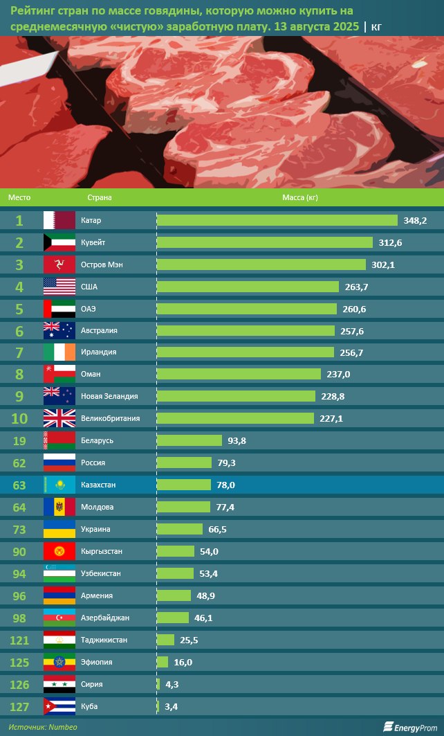 В международном сравнении Казахстан занимает занимает 63-ю позицию с показателем 78 кг говядины, которые можно приобрести на одну среднемесячную зарплату. Среди отдельных стран СНГ показатели распределились следующим образом: