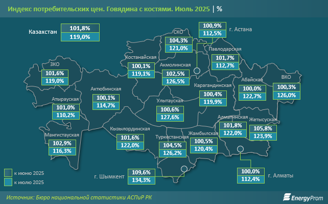 В то же время есть регионы, в которых говядина остаётся относительно доступной. К ним относятся Северо-Казахстанская, Павлодарская и Костанайская области, где цена на мясо ниже средней по стране. Разница в стоимости между дорогими и доступными регионами достигает значительных показателей, что указывает на влияние логистики, уровня производства и спроса на формирование цен.
