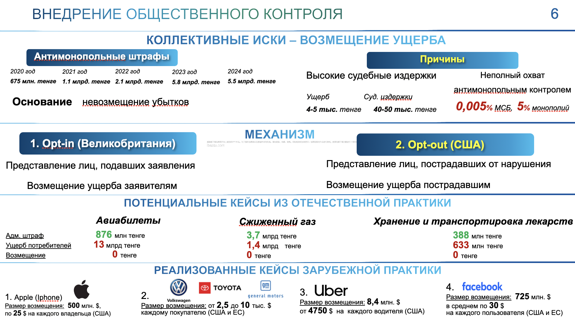 "Наши расследования позволят нам в рамках этого института обеспечить подачу исков от лица десятков, сотен, тысяч потребителей и обеспечить возврат средств в интересах этих потребителей. Есть и аналогичные зарубежные кейсы, которые мы будем в будущем применять у нас в Казахстане. Например, было замедление (работы. – Авт.) iPhone, в зарубежных юрисдикциях были коллективные иски, обеспечившие возврат потребителям 25 долларов каждому", – добавил Рустам Ахметов.