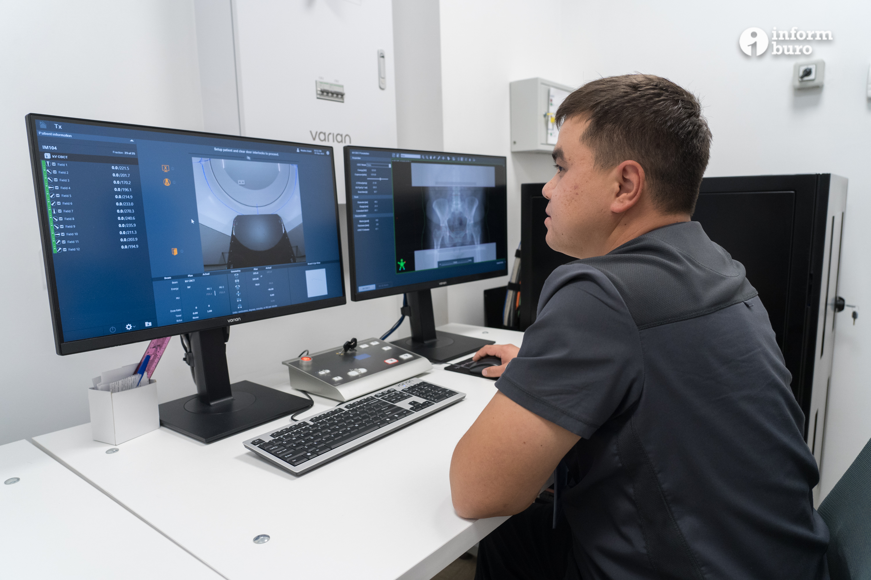 "Это последнее поколение. Выполняет абсолютно все функции, имеет элементы ИИ. На нём мы можем также лечить, как мы говорим, от макушек до пяток. Все виды локализации. И детей, и взрослых. Большая пропускная способность. Работает у нас по 8-12 часов. Здесь также открытый КТ, система визуализации, движение стола 6D, все позиции", – рассказал Ким.