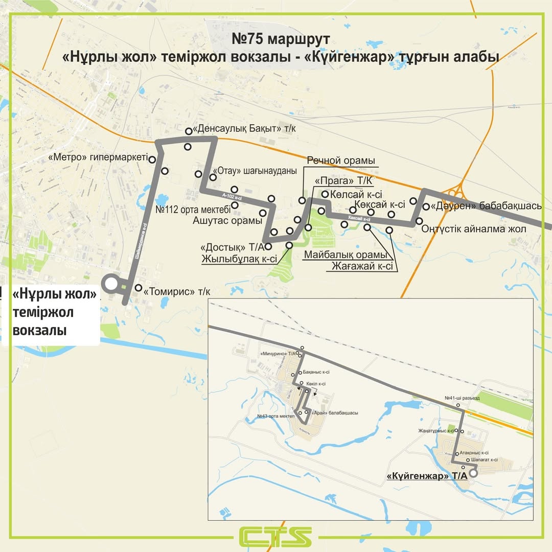 "Маршрут соединит жителей жилого массива Куйгенжар и Мичурина с железнодорожным вокзалом, а также улучшит транспортное обслуживание школы №112 и улицы Шаймерденова", – говорится в сообщении CTS.