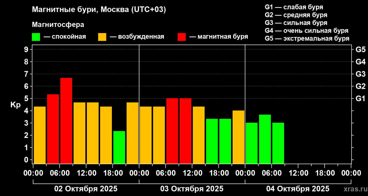 "С вечера пятницы, 3 октября, наблюдается быстрая стабилизация геомагнитной обстановки. Основной планетарный индекс Kp, по которому определяется начало и окончание бурь, опустился в зеленую зону и, за исключением короткого времени в конце вчерашнего дня, держится в ней уже около 17 часов. Факторов, способных вывести его из равновесия, не наблюдается", – говорится в сообщении.