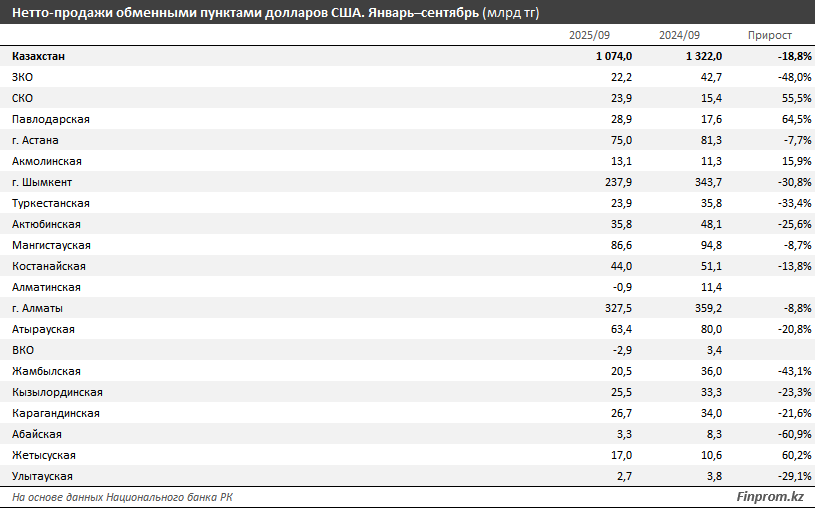 Продажи снизились почти по всей стране. Больше всего долларов покупали в Алматы и Шымкенте – 327,5 млрд и 237,9 млрд тенге. Но даже там спрос упал: в Алматы примерно на 9%, в Шымкенте почти на треть. Сокращение заметили в Астане, Атырауской и Мангистауской областях. А в двух регионах – Восточно-Казахстанской и Алматинской областях – соотечественники наоборот обменивали на тенге больше валюты, чем покупали.