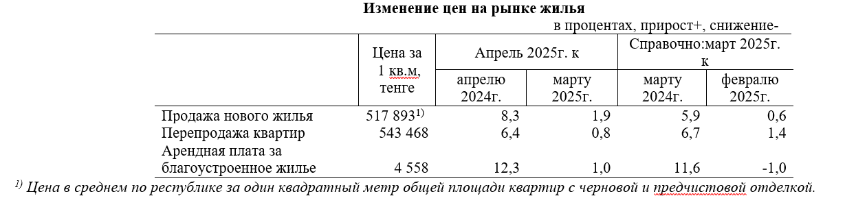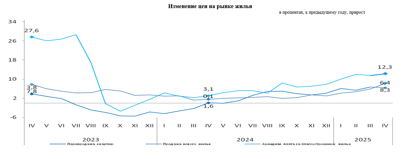 Цены на новое жильё за год увеличились на 8,3%, на вторичное – на 6,4%. Аренда благоустроенного жилья подорожала на 12,3%. В Павлодаре цены на первичное жильё выросли на 21,4%, в Талдыкоргане – на 12,6%, в Шымкенте – на 12,5%.