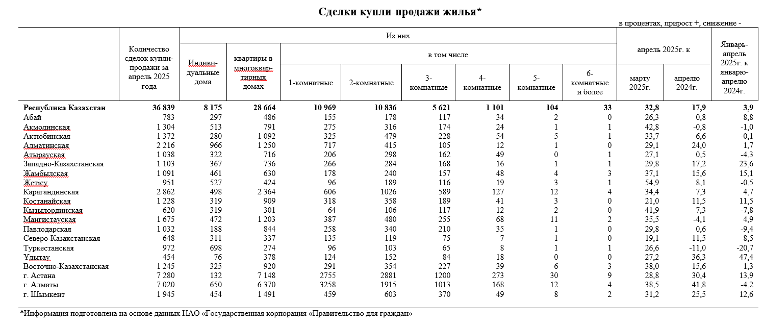 В годовом сравнении количество сделок выросло на 17,9%. В Алматы прирост составил 41,8%, тогда как в Туркестанской области отмечено снижение на 11%.