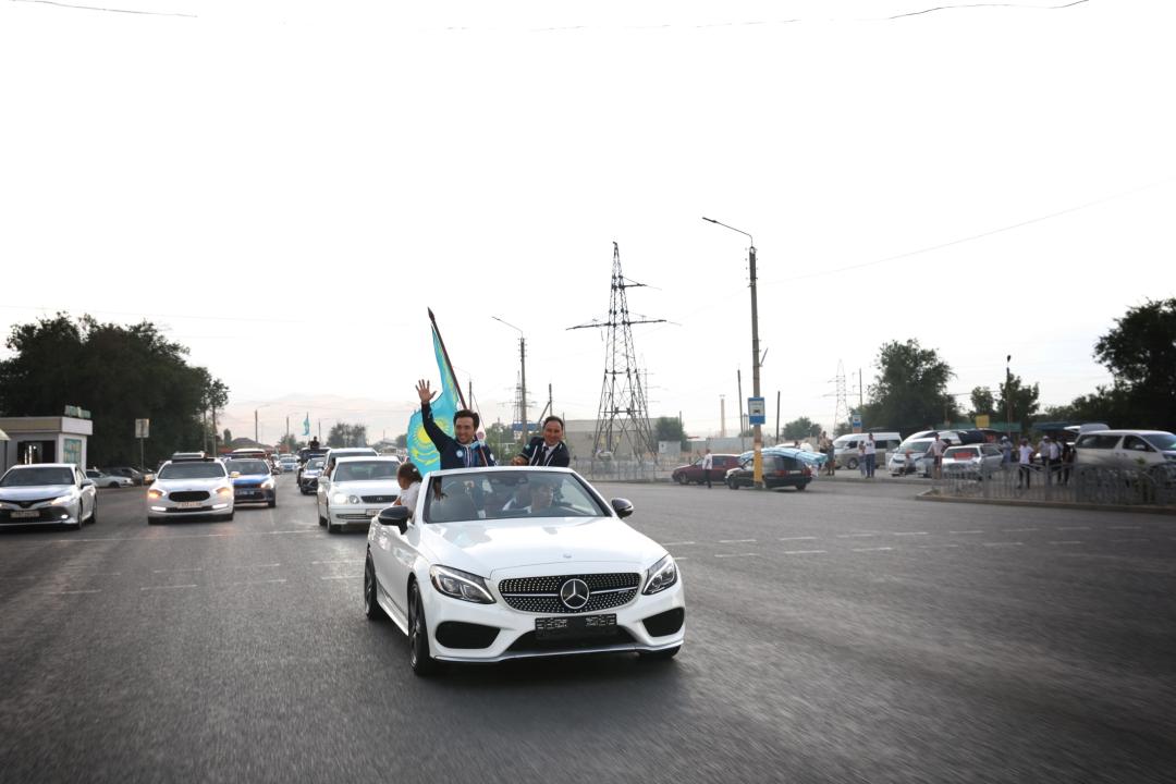 Жители региона встречали чемпиона у восточных ворот Тараза. В кортеже из десятка машин Елдоса Сметова провезли по главным улицам города.
