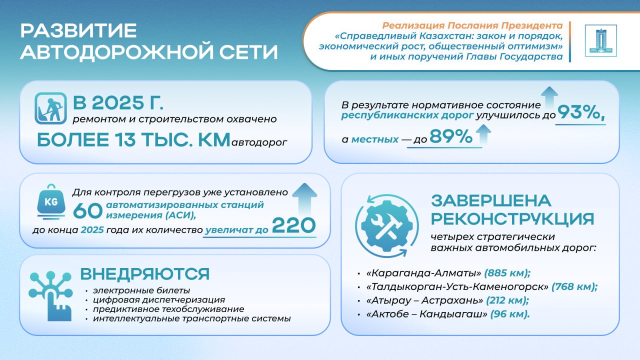В 2025 году ремонтом и строительством охватили более 13 тысяч км автодорог. Из них по 7000 км производится средний ремонт. Отремонтированы участки таких автодорог, как: