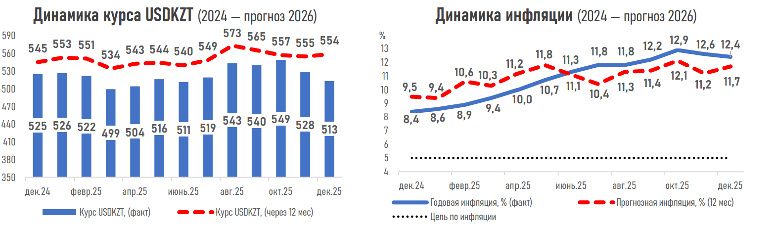 Оценки по инфляции ухудшились. Эксперты повысили прогноз на год вперёд до 11,7%. Они указывают на риски дешёвой нефти, возможного ослабления тенге и предстоящих налоговых изменений. Ускорение инфляции в ноябре, по их словам, подтверждает отсутствие устойчивого замедления цен. Прогноз по инфляции пересмотрел и Нацбанк.