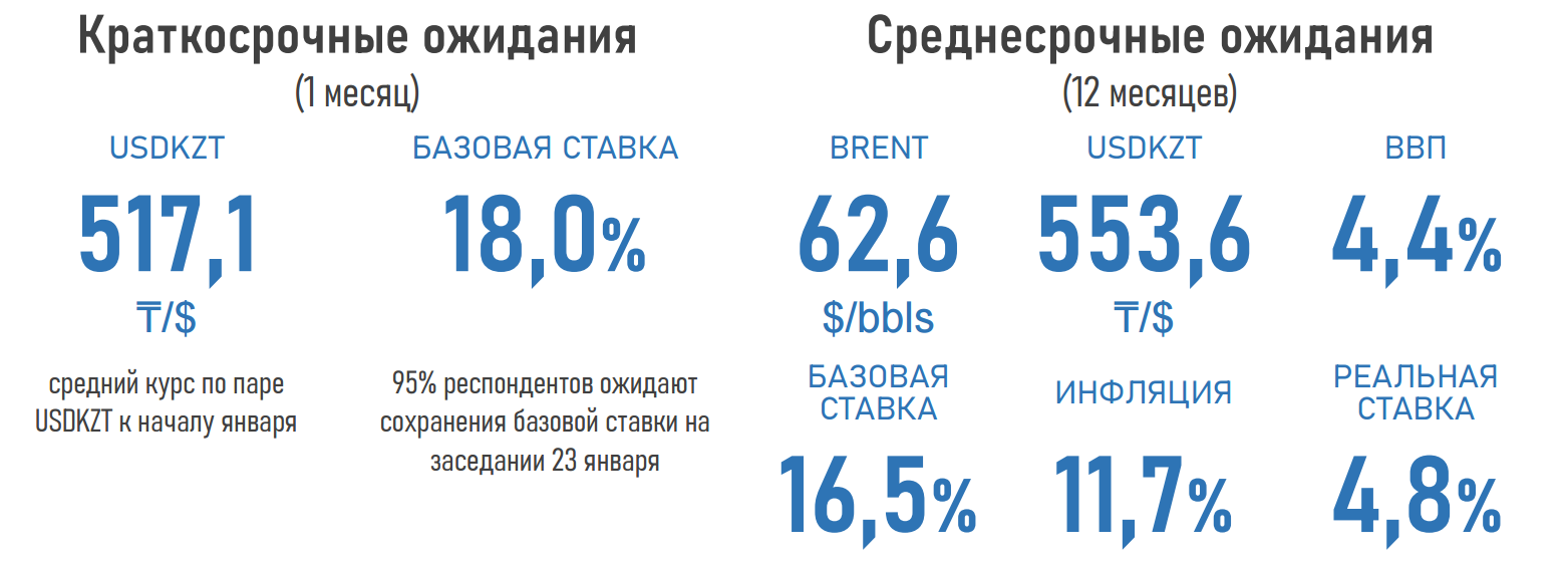 Участники рынка считают, что Нацбанк сохранит базовую ставку на уровне 18% на заседании 23 января 2026 года. Через год они ждут снижения ставки до 16,5%, если разовые проинфляционные факторы ослабнут, внутренний спрос остынет, а объём фискальной поддержки уменьшится.