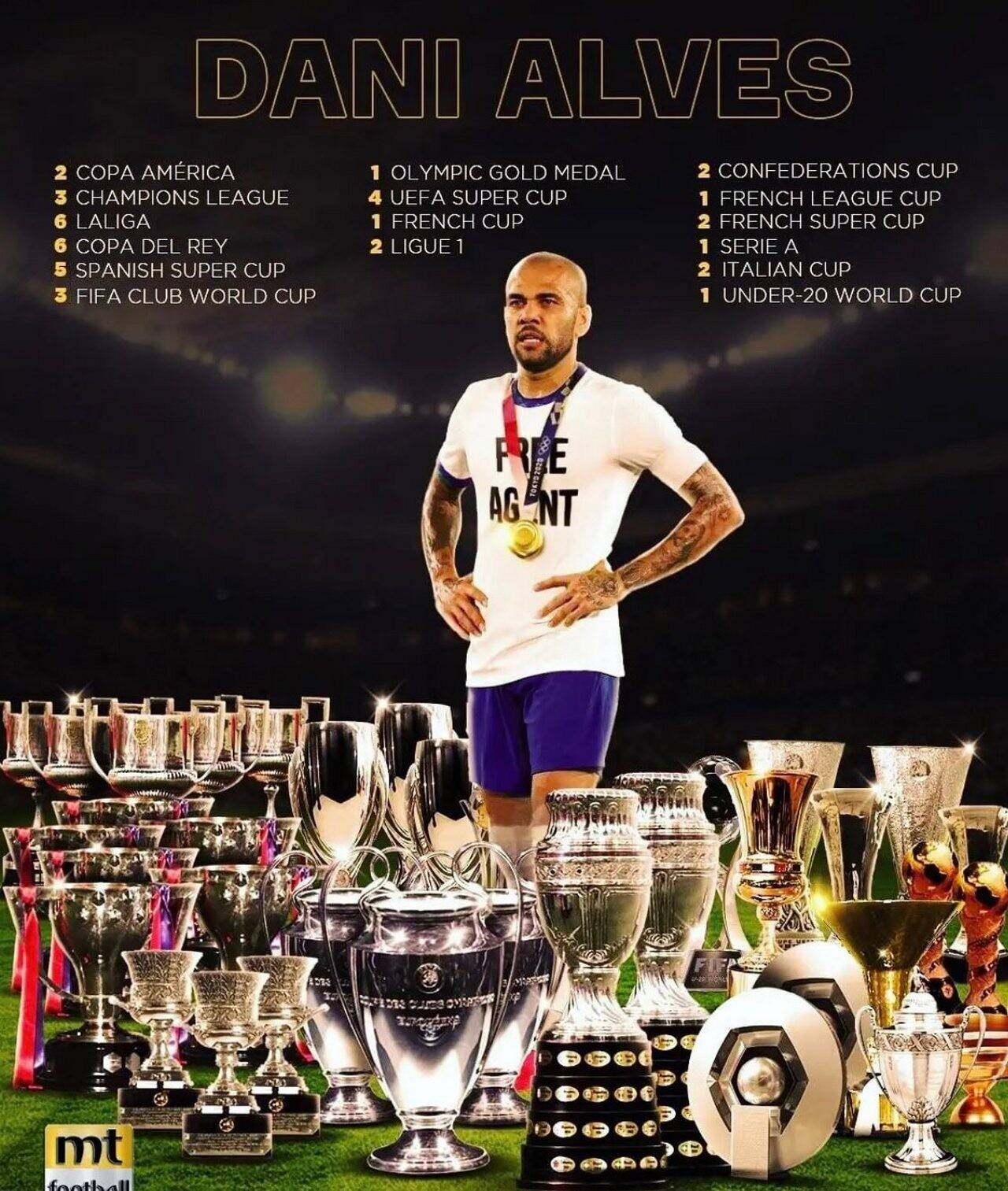 39-летний Дани Алвес – один из самых успешных футболистов, за свою долгую карьеру выигравший главные титулы для Бразилии и нескольких элитных клубов, включая "Барселону", "Ювентус" и "Пари Сен-Жермен". Его называют самым титулованным футболистом в истории.