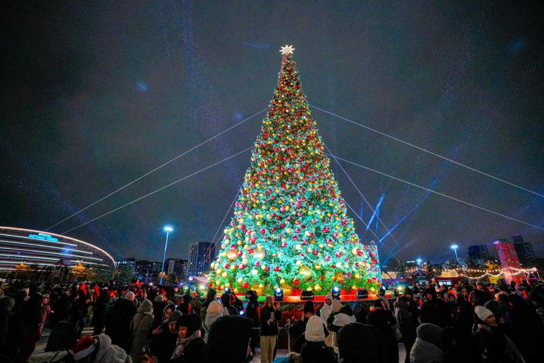 В столице огни на 25-метровых новогодних ёлках зажгли 19 декабря сразу в нескольких локациях: на парковке стадиона Astana Arena, на площади возле монумента "Қазақ Елі", на набережной реки Акбулак и в Ботаническом саду. Однако центральным символом Нового года стала главная ель возле арены, которую украсили световыми снежинками, декоративными узорами, гирляндами и праздничными игрушками.