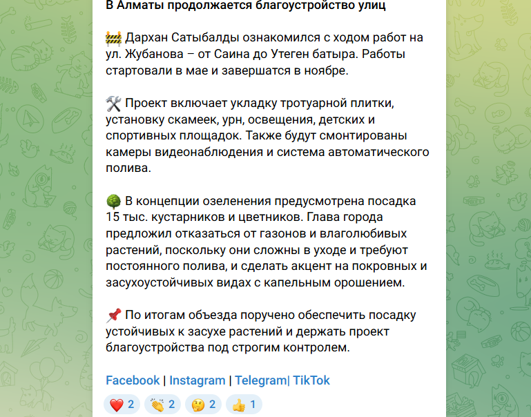 24 августа пресс-служба акимата Алматы сообщала, что Дархан Сатыбалды во время выезда в Ауэзовский район предложил отказаться от газонов и влаголюбивых растений, поскольку они сложны в уходе и требуют постоянного полива.