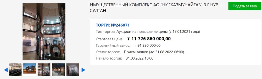 Штаб-квартиру АО "КазМунайГаз" планируют продать на торгах за 11,7 млрд тенге. Аукцион на повышение цены состоится 31 августа.