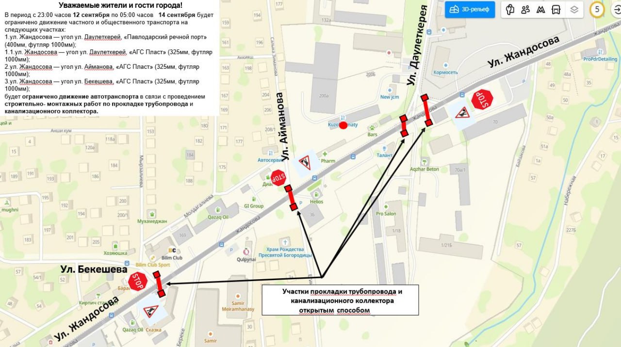 "В связи с проведением строительных работ по прокладке трубопровода и канализационного коллектора с 23.00 12 сентября до 5.00 14 сентября будет ограничено движение автотранспорта по улице Жандосова", – говорится в сообщении.