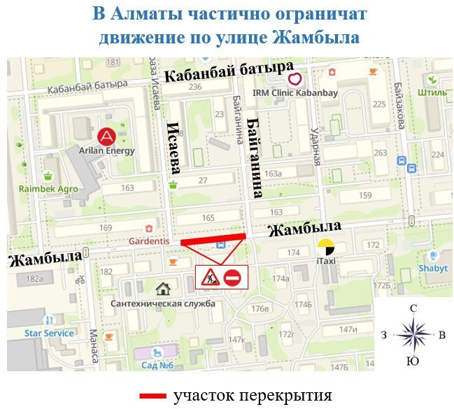 С 23.00 14 августа до 7.00 18 августа будет закрыт проезд между улицами Исаева и Байганина. Участок находится в Алмалинском районе южной столицы.