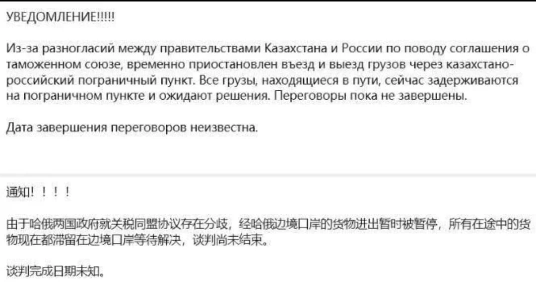 В мессенджере WhatsApp распространилось сообщение, что якобы "из-за разногласий между Казахстаном и Россией по соглашению о таможенном союзе временно остановлен въезд и выезд грузов через границу".