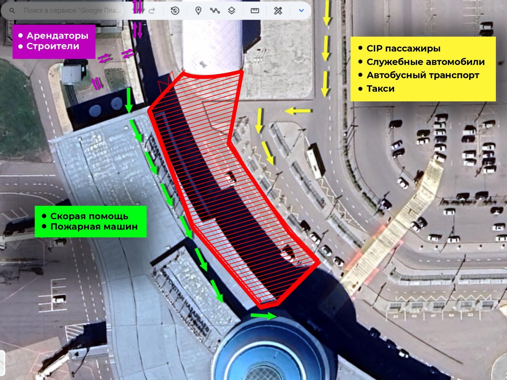 - проезд для машин скорой помощи и пожарной службы будет осуществляться под навесом терминала Т2;