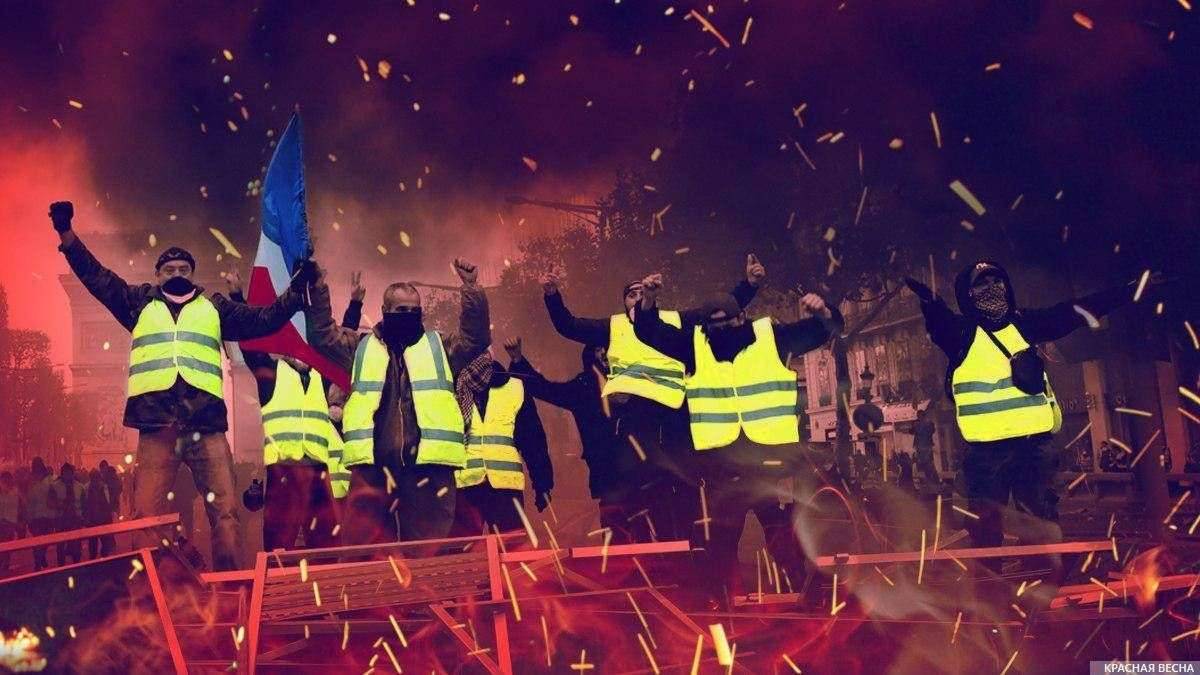 15 декабря, Вести.ru: "жёлтые жилеты" под "Марсельезу" прорвали кордон парижской полиции". Звучит марш революции. Люди (тысячи людей) в жёлтых светоотражающих жилетах, используемых с целью идентифицировать принадлежащих к этому движению, идут по улицам Парижа.