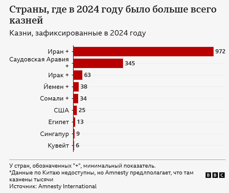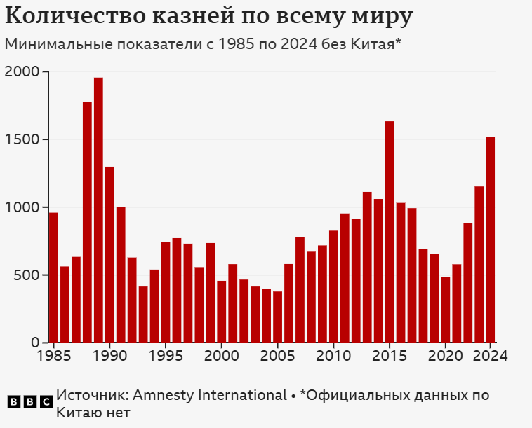 "Наши общие данные за 2024 год не включают тысячи казней и смертных приговоров, которые, по нашему мнению, продолжали происходить в Китае", – сказала Би-би-си эксперт Amnesty International Кьяра Санджорджио. – Данные о смертных казнях остаются государственной тайной, но та информация, которую нам удалось собрать, рисует ужасающую картину".