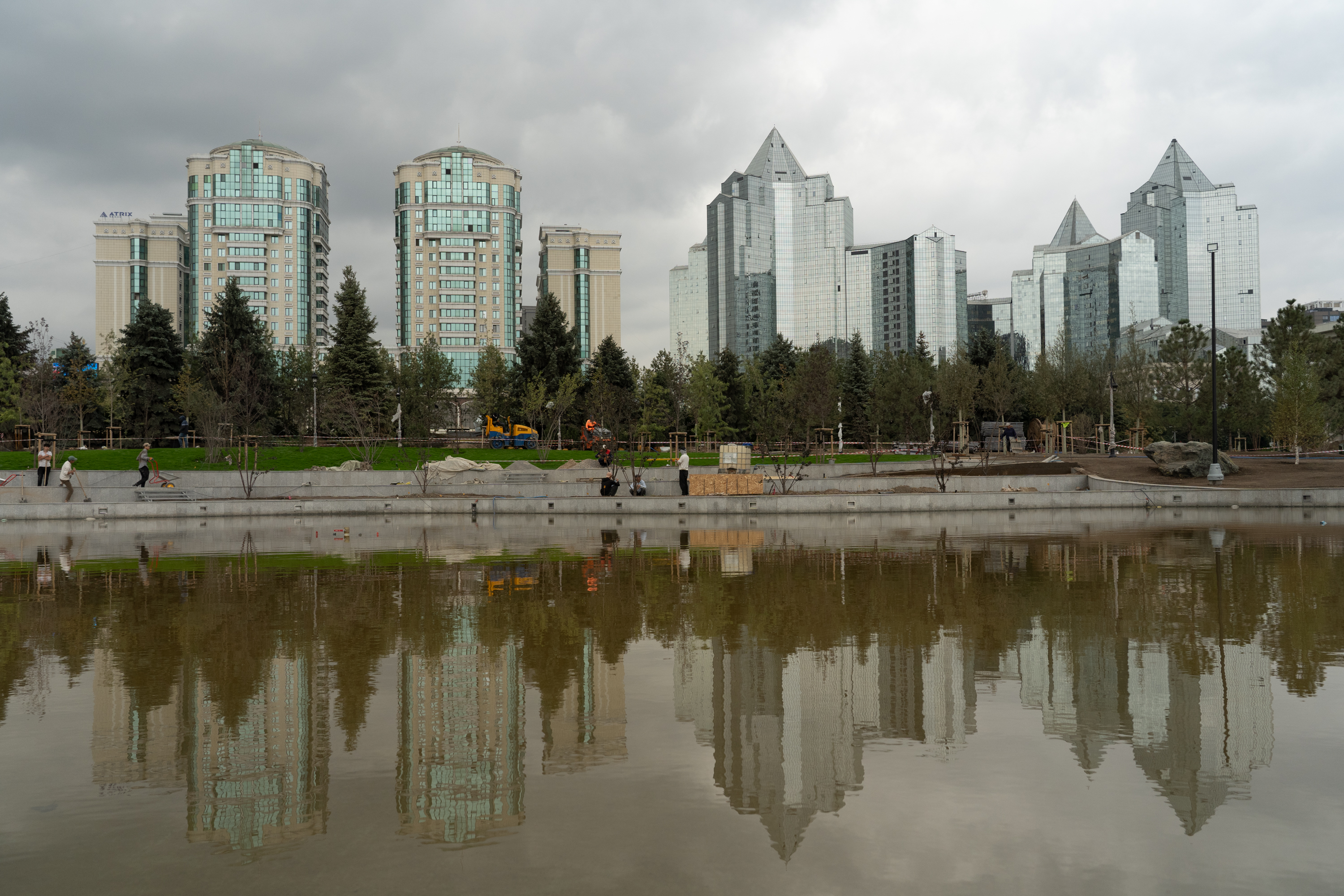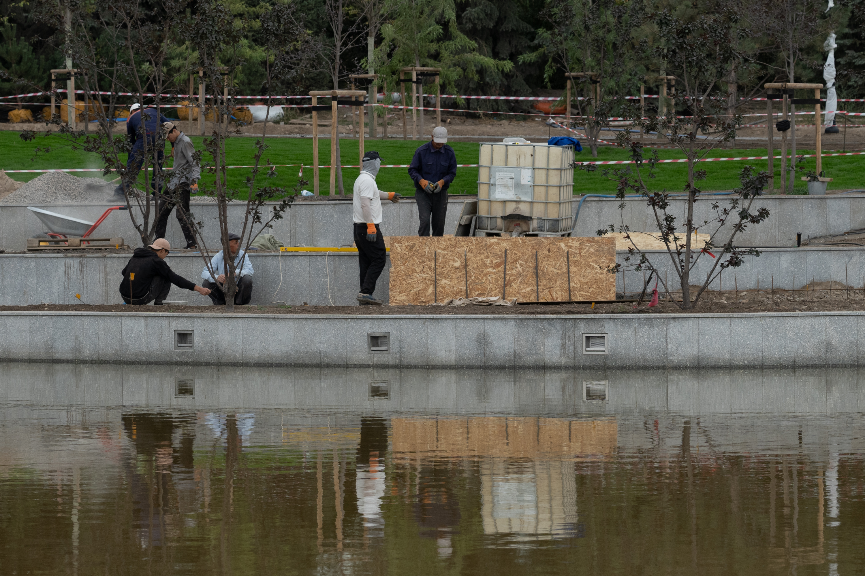 Работы по демонтажу бетонного слоя кровли служебного здания, фонтана, брусчатки и бетонного основания полностью завершены, закончилось строительство пруда, высажено 323 крупномерных дерева, проведены водопровод и канализация. В отдельных зонах функционирует система автоматического полива.
